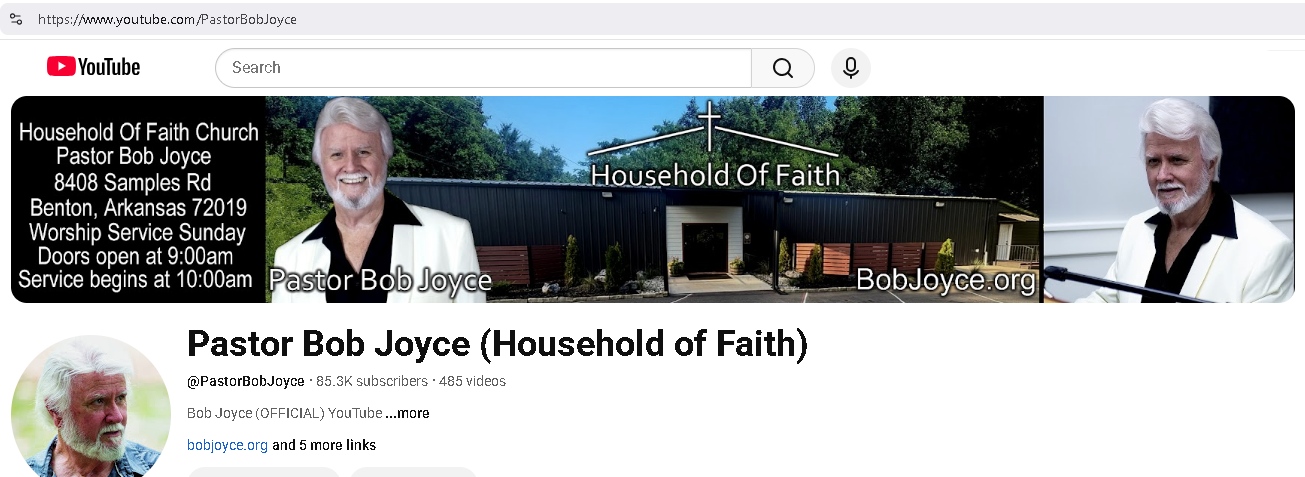 The official YouTube channel for all sermons, music, and other videos by Pastor Bob Joyce at Household of Faith since August 2022 is YouTube.com/PastorBobJoyce