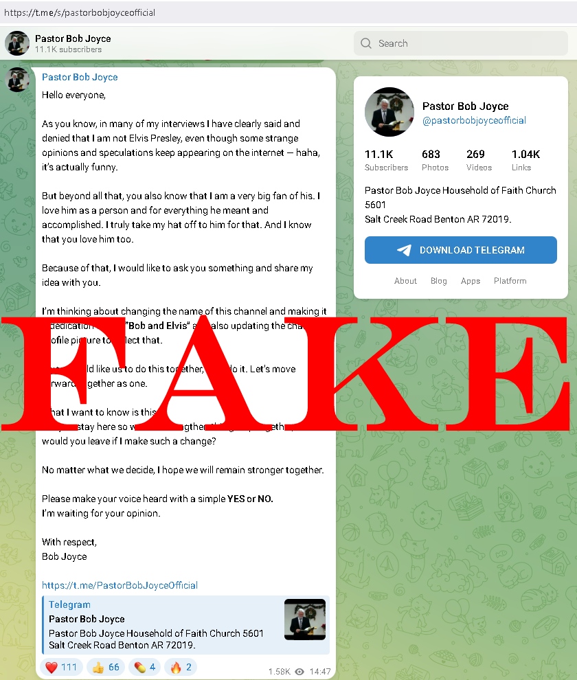 Please be aware that Pastor Bob Joyce is not on Telegram.